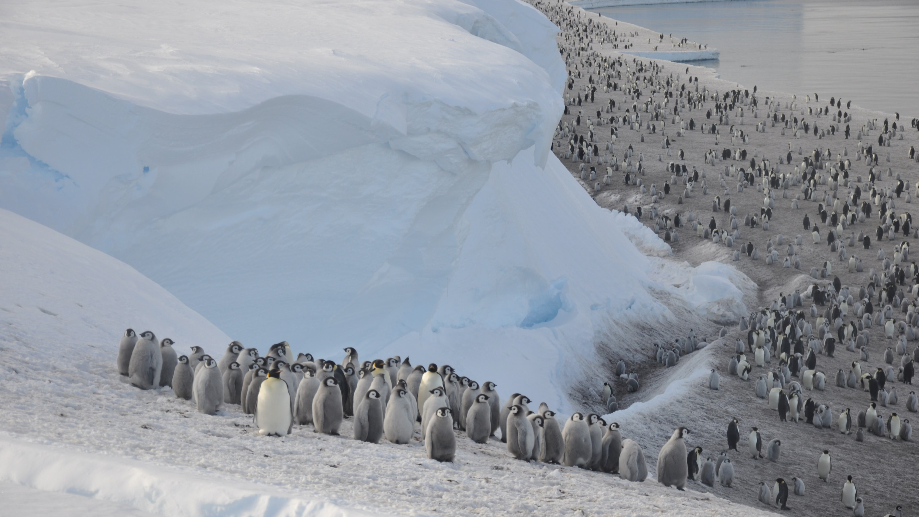 The ice platform needs to be long-lived, to stay intact for at least eight or nine months. If it forms late or breaks up too early, the young birds may be forced into the sea before they're ready, before they've lost their down and grown water-proof feathers. They would likely then freeze and drown.